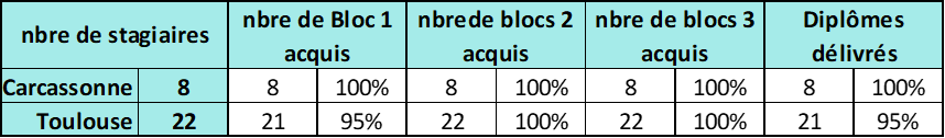 – 34 stagiaires sur la Haute Garonne : 4 abandons et 30 stagiaires présenté-es aux certifications finales