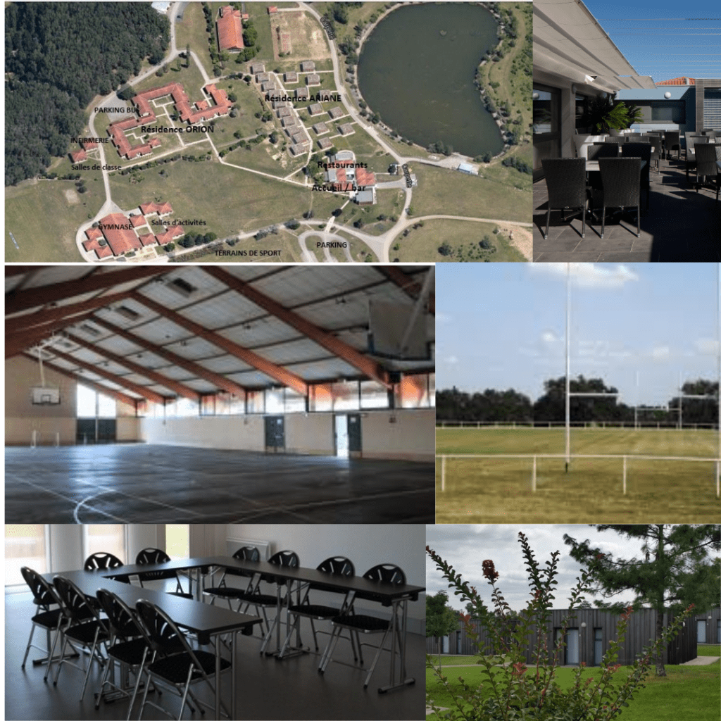 1 terrain de rugby, 1 terrain de football, 2 courts de tennis, 1 terrain de Basket, 2 boulodromes, 1 gymnase, Vestiaires…